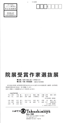 « 院展 俊英作家展 狩俣公介展 » 院展受賞作家選抜展 2009年8月19日10:00 AM 本年度春の院展・春季展賞受賞作家2名をはじめ、歴代の日本美術院賞(大観賞)・春季展賞、奨励賞受賞作家の作品を一堂に展観いたします。 是非この機会にご高覧賜りますようご案内申しあげます。 院展受賞作家選抜展 会期:2009年8月19日(水)~25日(火) 会場:いよてつ髙島屋 6階美術画廊 « 院展 俊英作家展 狩俣公介展 »